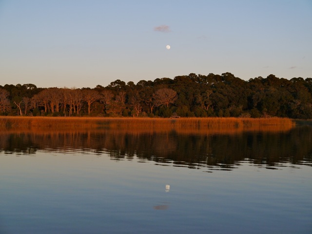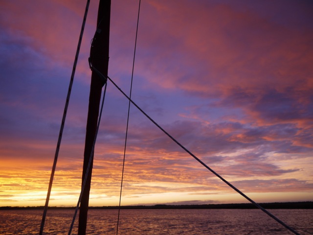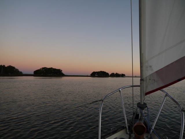 We had a wonderful beginning of 2014, and thanks to the vicinity of Kate’s family we could explore the surrounding of Beaufort and St.Helena Island, and also enjoy some family time. We left Dataw Island, our previous stop in South Carolina, on 8th January with sustained winds and 6-10 foot waves. Some of them crashed into the cockpit, Kate and I had a couple each during our watches. It was a downwind gybin’ night zigzagging our route past the busy Savannah entrance and the following Sounds. Tranquility surfed downwind the steep waves, but keeping her on course was a hard job with the tiller, even with just the the jib and a deep reefed mainsail.