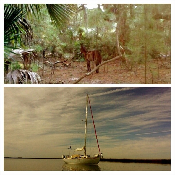 Georgia has a short but beautiful coastline, with lots of inlets, islands and rivers. The tide here has a big impact, with ranges up to 7 ft. (2,13 m) or more during spring tides, with consequent strong currents. It changes the shape of the coast every six hours. We can only move around at certain times and the tide stream is often stronger than the wind so we have to keep it in mind when anchoring and docking. People here are warm and welcoming and we had the best shrimps so far enjoying what they called “Lowcountry boil” in Jekyll Island. Cumberland Island is what made us come here. Kate wanted to encounter the wild ponies that live free on the island so badly and she made it the liet-motiv of our sail down the East Coast : “I want to see wild ponies! I want to see the wild ponies! When are we stopping to see the wild ponies?“