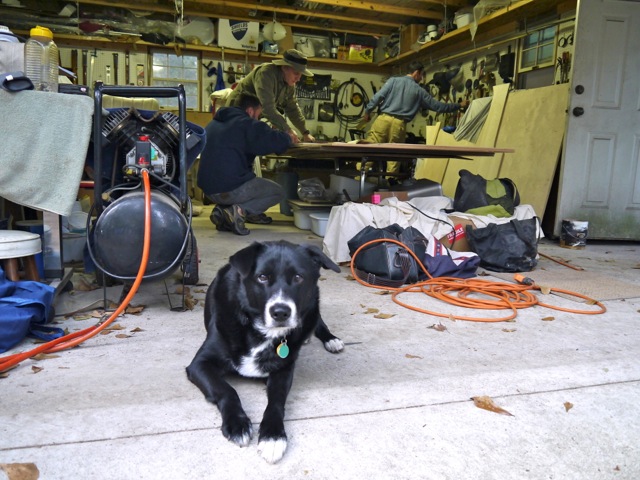 Three layers of pants (long johns bottom, corduroy pants, and waterproof pants on top or PVC overalls)