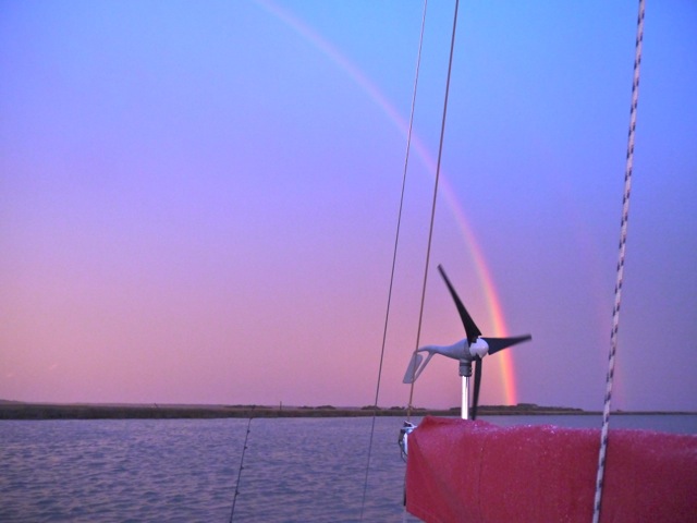 The blow lasted less than ten minutes, very violent though. Our anchor didn’t drag a single inch but I am glad it was a just very short blast. We had two casualties: one of Kate’s babbucce (italian for slippers) and one of the planks of the companionway door (!!). We are still trying to recover from such losses, especially the beloved babbuccia. In less than 1 hour a double arch rainbow and a breathtaking sunset showed up and everything was calm and cheerful. Later other cruisers in the area told us that their wind instruments went over 60 kts during one of the gusts. It could be the case that sailors are worse liars than fishermen, but even if these top speeds never occurred we had severe winds and we were happy to be in a sheltered anchorage.