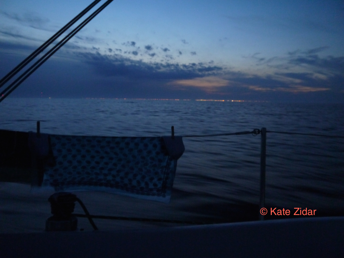 It was a very nice ride indeed. The Gulf stream current flows close to the Outer Banks Coast. We were sailing downwind about twenty miles offshore in light winds and still we had a steady progress of 4kts even 5kts at times. On a calm ocean we slipped into our watch routine mile after mile and had no visits from thunderstorms. The depth sounder took a peak of what’s outside the Continental Shelf and settled to 385 feet (apparently its maximum reading), but according to the charts we were in an area of 1600ft of depth. Kate shivered trying to imagine such an ocean depth. Here the water was really blue and turned violet when the sun was setting.