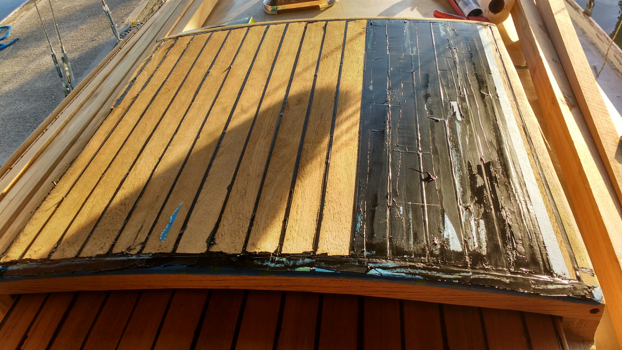 After the epoxy cured (12 to 24 hours) the old teak strips can go back in place, having care to number each one to find the better combination. Once the sequence is chosen, we have to work very quickly and mix epoxy and filler to attach the strip to the plywood. I ended up using quite a bit of resin and filler to fit all the pieces.