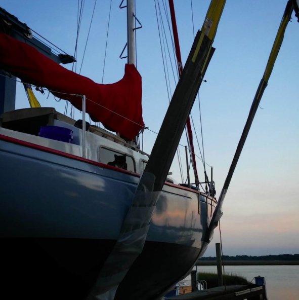 I am fortunate I got to be in a very private corner of the boatyard so my mess is hidden. Tranquility is parked stern to the edge of the property, against a fence with climbing vines and tall trees. My port windows face the North River and I can observe the marsh and boats at anchor from where I sit at my table. My only neighbor in a radius of 80ft (25 meters ) is Bill, who is a long time friend, solo sailor, inventor and “connazionale” (he is American and he also holds an Italian passport). He tolerates my mess and contributes with his own, although I have to say I am undefeated to this day.