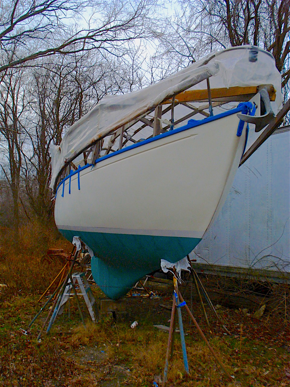 The deal was closed during the snowy New England winter and we became the new owners of a boat with primed hull and deck, standing and running rigging laying on stands and an electric inboard motor with a dubious battery bank.